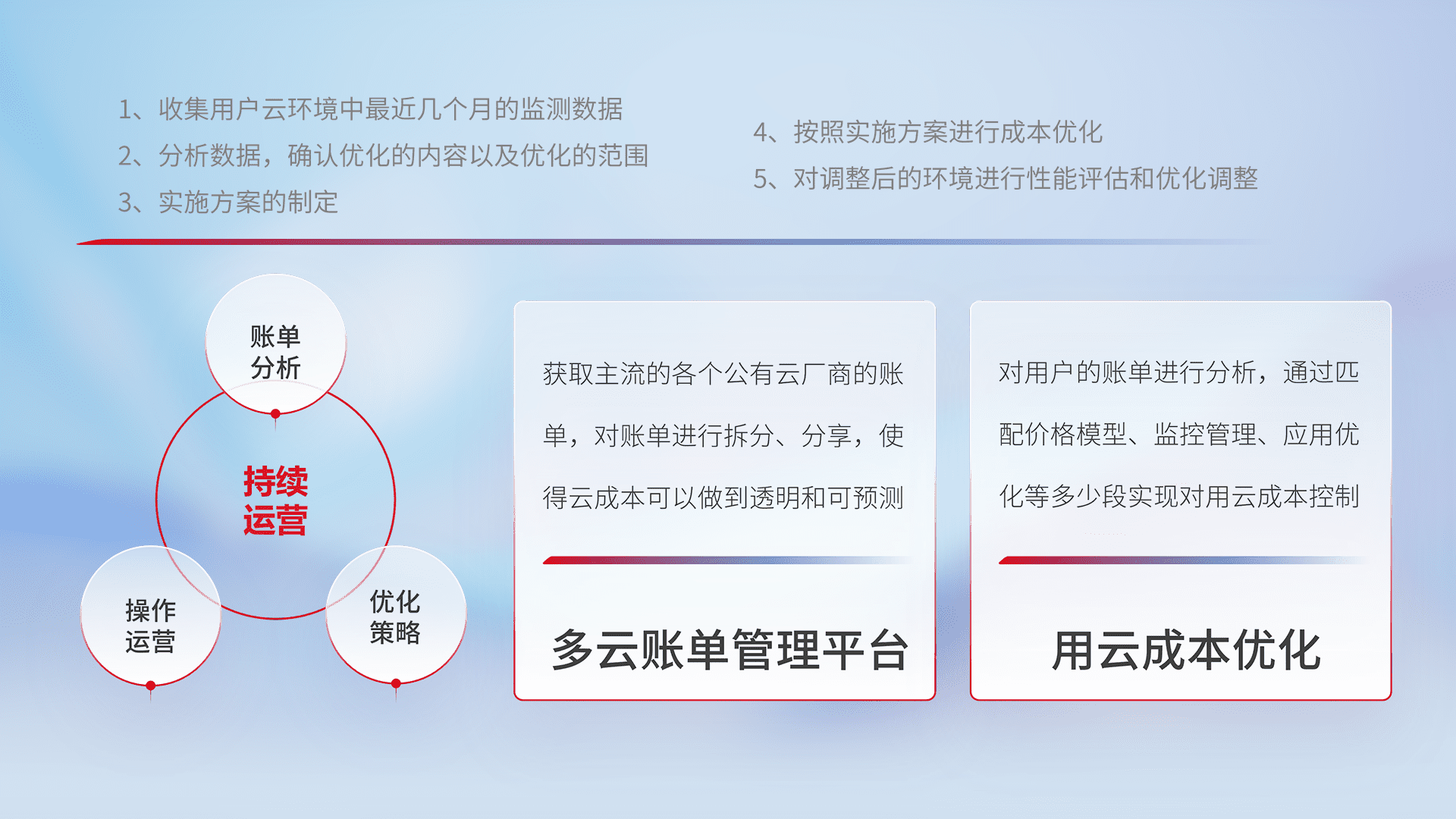 通过多云纳管,,以统一的资源数据模型把客户的云资源进行抽象和封装,,,进而实现对多云资源的统一操作,,保障云资源管理的可靠性、、、稳定性与可用性。。量身定制化运维内容,,,配置、、开发运维、、补丁管理、、备份、、监控、、、、认证和访问管理、、、、审计和日常巡检等,,,,保障在用云过程中的可靠度,,,,稳定度以及高可用率。。