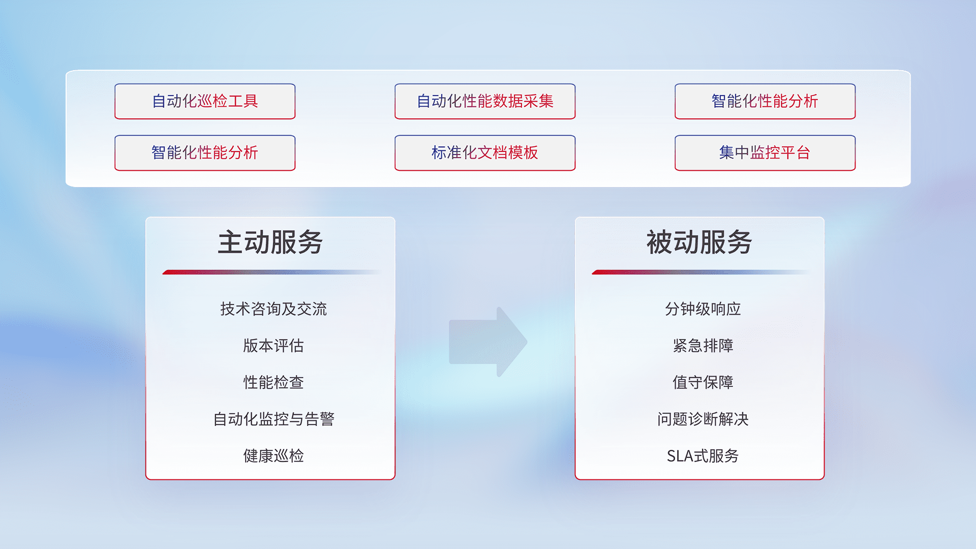 智能化工具和标准化文档,,,保障服务质量,,,提供主动服务(包含技术咨询、、、版本评估、、、、性能检查、、自动化监控与告警、、、、健康巡检)和被动服务包含(分钟级响应、、、、紧急排障、、、值守保障、、问题诊断解决、、、、SLA服务)。。。。